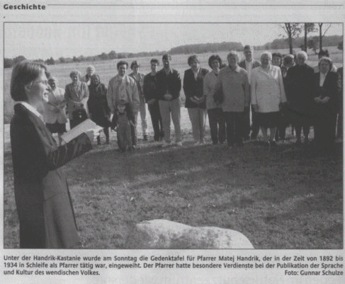 (14.10.) Nach dem großen Festgottesdienst wurde eine Gedenktafel an unseren ehemaligen (vorletzten) sorbische Pfarrer Matej Hanrik (Matthäus Handrick) neben der Handrik Kastanie eine Gedenktafel enthüllt.